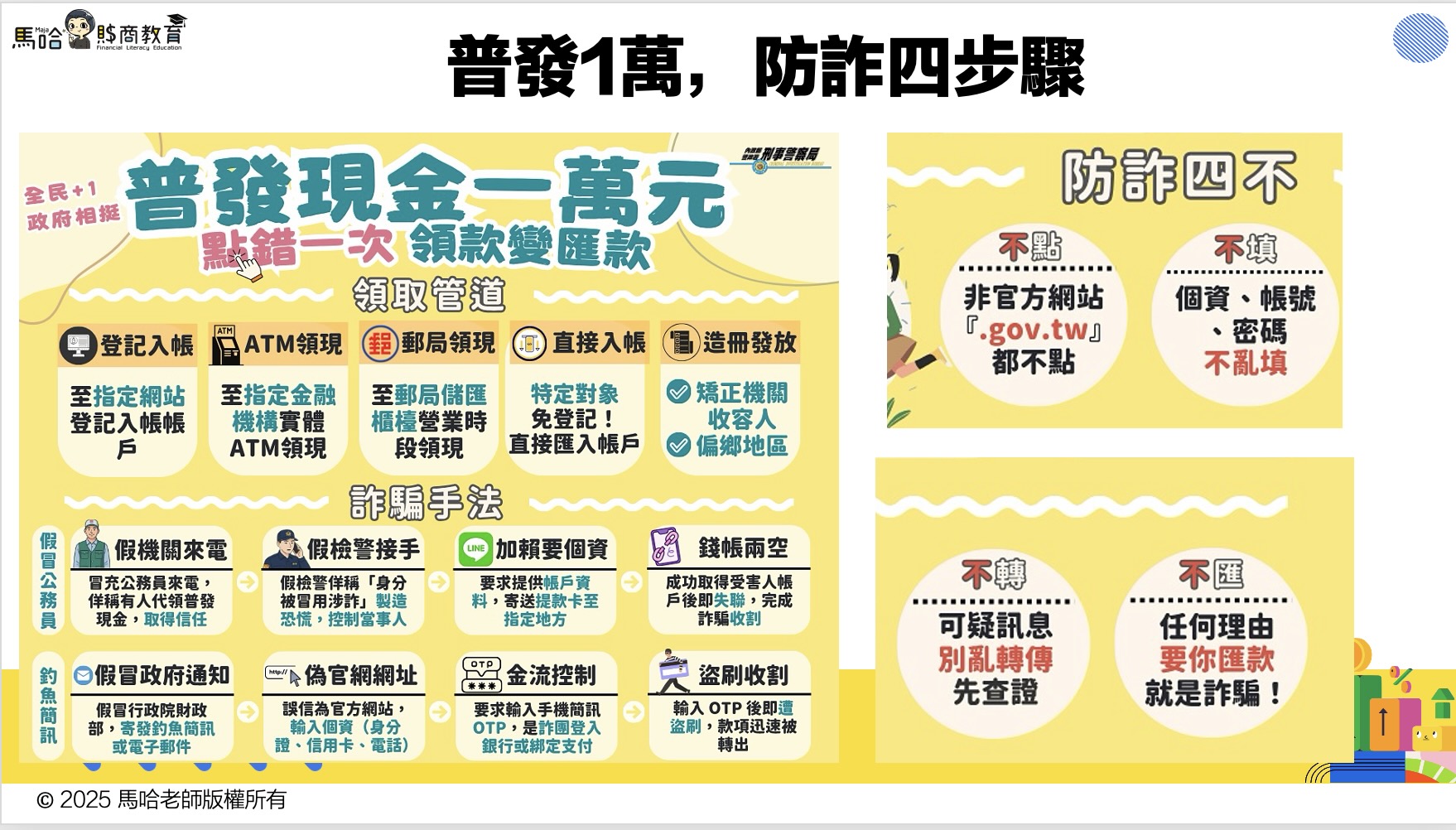 早在政府是否通過普發一萬元前,新聞就報導有許多民眾因普發一萬元而被詐騙的消息,詐騙集團早就磨刀霍霍,利用他們最擅長的「假通知、假連結、假客服」來騙取帳號或個資。父母可以趁這次機會,帶孩子一起練習「防詐四不原則」——