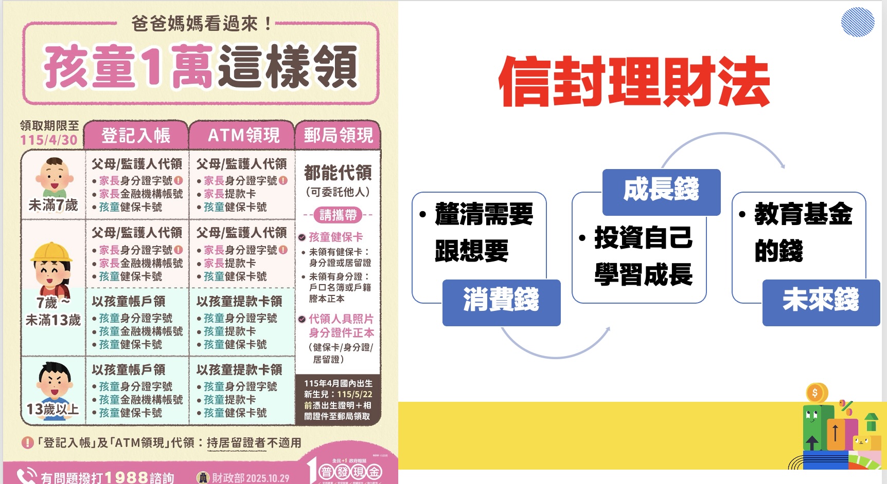 「這一萬元到底要怎麼用?」父母可以準備三個信封,貼上標籤:「消費錢、成長錢、未來錢」。